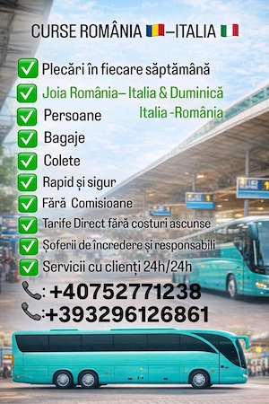 In fiecare săptămâna efectuam 2 curse externe pentru transport persoane colete de la adresa la adresa FĂRĂ TRANSFERURI și fără platformă după mașină Oferim gratuit wi-fi pt toti pasagerii pe toata durata calatoriei. Plata se poate face si la destinatie.