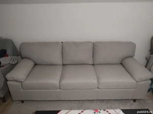 Canapea ne-extensibilă gri, 3 locuri, 2,1 m. x 0,8x0,8m. Ca nouă. Nu am dormit în ea, doar a stat acoperită cu o pătură contra prafului și am ținut niște haine pe ea. Am și una de 2 locuri aceeași culoare, același model. Amândouă sunt luate de la Jysk. Se pot căuta și azi pe site-ul acestui magazin . ...