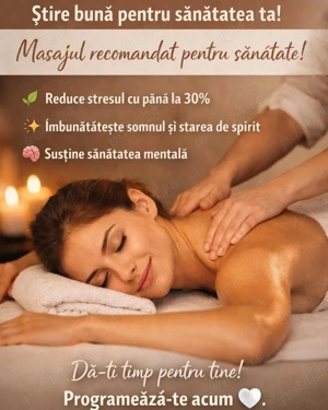 maseuză califică cu experiență ofer masaj de relaxare, întreținere și reflexo adaptat nevoilor tale personale Intr -un ambient plăcut și curat.Ofer calitate și seriozitate,la fel doresc și din partea dv.Programari zilnice intre orele 10:00 și 21 00.Tel