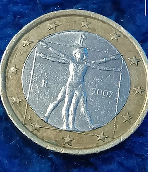 Moneda 1 euro-anul 2002 Monetărie: Instituto Poligrafico e Zecca dello Stato, Roma, Italia Avers : R- Omul Vitruvian Compoziţie:Bimetal alama-cupru Muchie: zimtat-neted Greutate: 7,5 grame Diametru: 23,25 mm Grosime: 2,33 mm Avers: Omul Vitruvian al lui Leonardo da Vinci inconjurat de 12 stele cu cinci ...