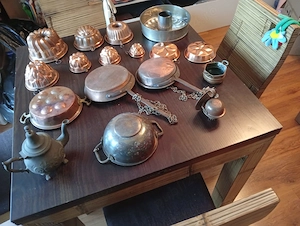Vand set de obiecte din cupru vintage, in stare buna. Include forme prentru prajituri, tigai vechi si obiecte decorative. Ideal pentru decor rustic, restaurant, Airbnb sau colectionari. Nu sunt restaurate excesiv - pastreaza patina originala. Se vince ca set complet, predare in Bucuresti.
