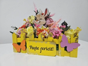 1. Aranjament de Paște handmade, realizat cu atenție la detalii. Cutie decorativă tip garduleț, în culoare galben, cu mesaj Paște fericit! . Flori din săpun în nuanțe de roz, galben și portocaliu, cu aspect realist și parfum delicat. Iepuraș decorativ, care oferă un aspect vesel și atractiv. Decorațiuni ...