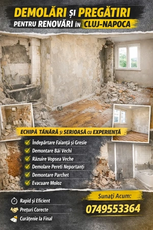 Ai în plan o renovare în Cluj-Napoca? Lasă partea grea în grija noastră! Oferim servicii complete de demolări și pregătiri pentru renovări: Îndepărtare faianță și gresie Demontare băi vechi Răzuire vopsea veche Demolare pereți neportanți Demontare parchet Evacuare moloz Echipă tânără ...