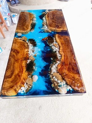 Măsuță pentru cafea, din rășină epoxidică, model efect de râu.